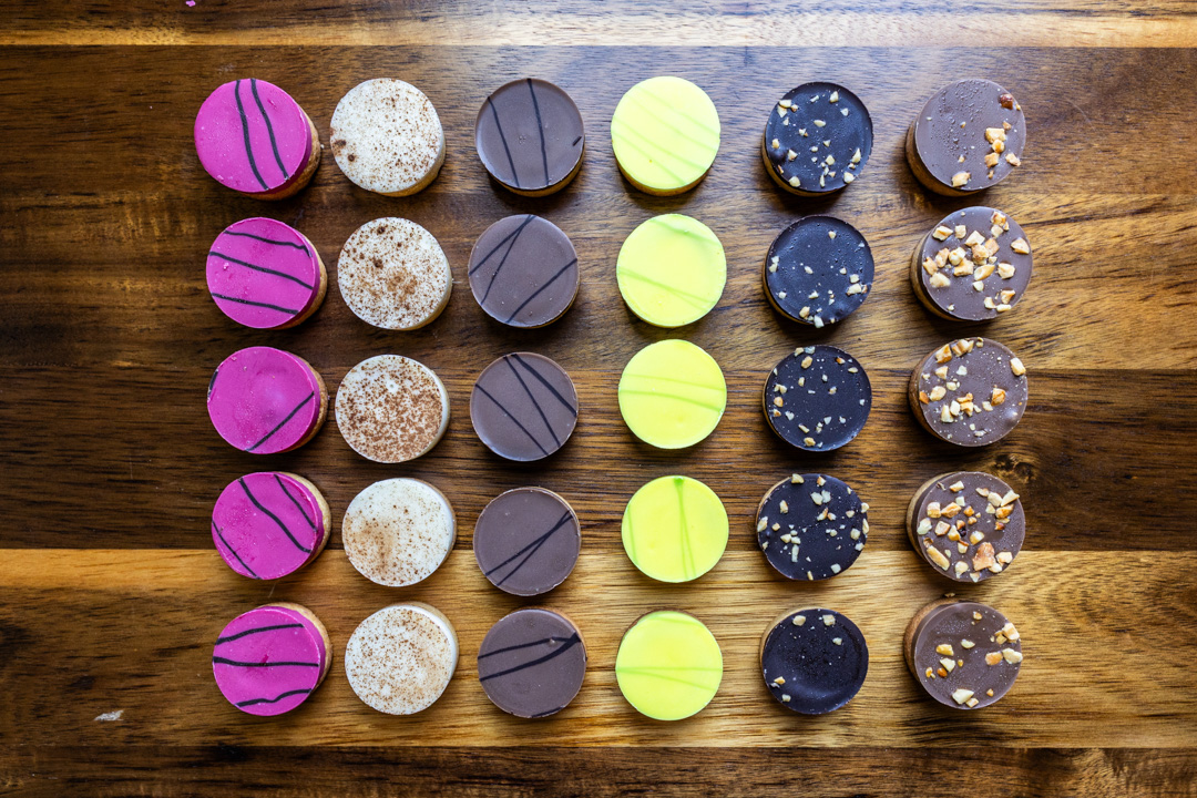 Shortbread cookies, filled with smooth, creamy inserts and finished with a layer of velvety chocolate. Flavors include: Caramel, Chai, Chocolate Hazelnut, Lemon, Peanut Butter, Raspberry.